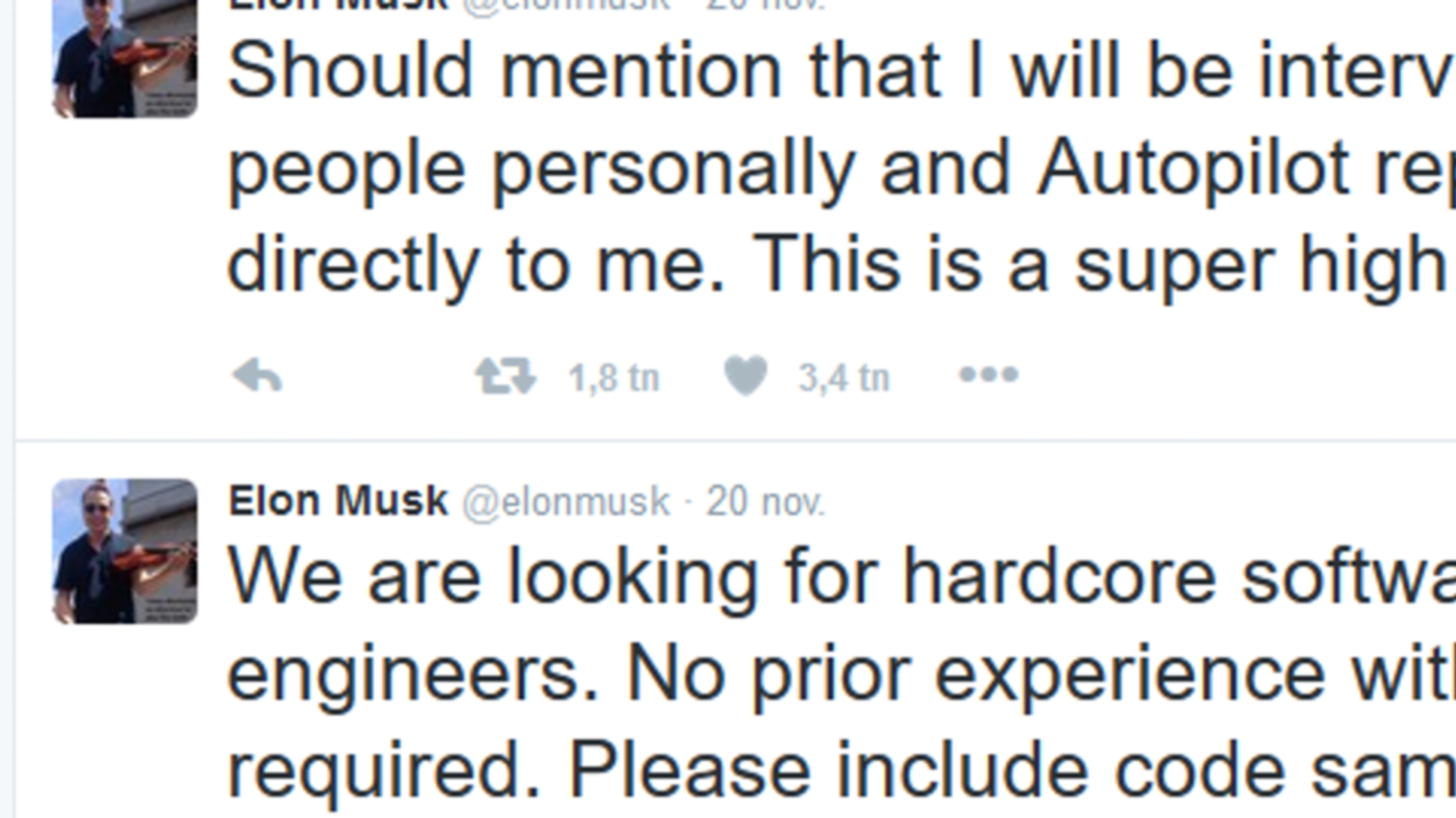 Teslas vd Elon Musk verkar inte vara helt nöjd med företagets autopilotfunktion. I en rad tweets meddelar han att man söker kompetenta mjukvaruutvecklare och att han själv kommer att stå för anställningsintervjuerna. Han lockar också med att de som anställs kommer att vara direkt underställda honom.