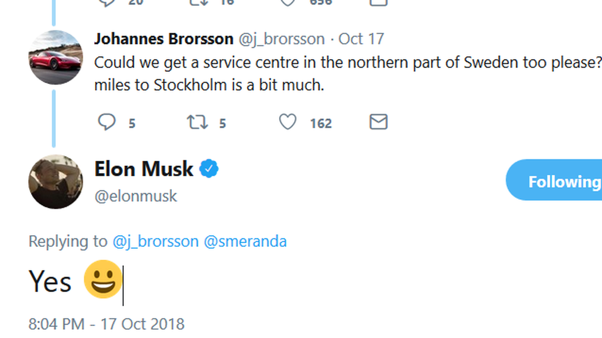 Den här gången bestod tweeten bara av ordet ”Yes” åtföljt av en glad smiley. Detta som ett svar till @j_brorsson, Johannes Brorsson, som hade twittrat ”Could we get a service centre in the northern part of Sweden too please? 300+ miles to Stockholm is a bit much.”