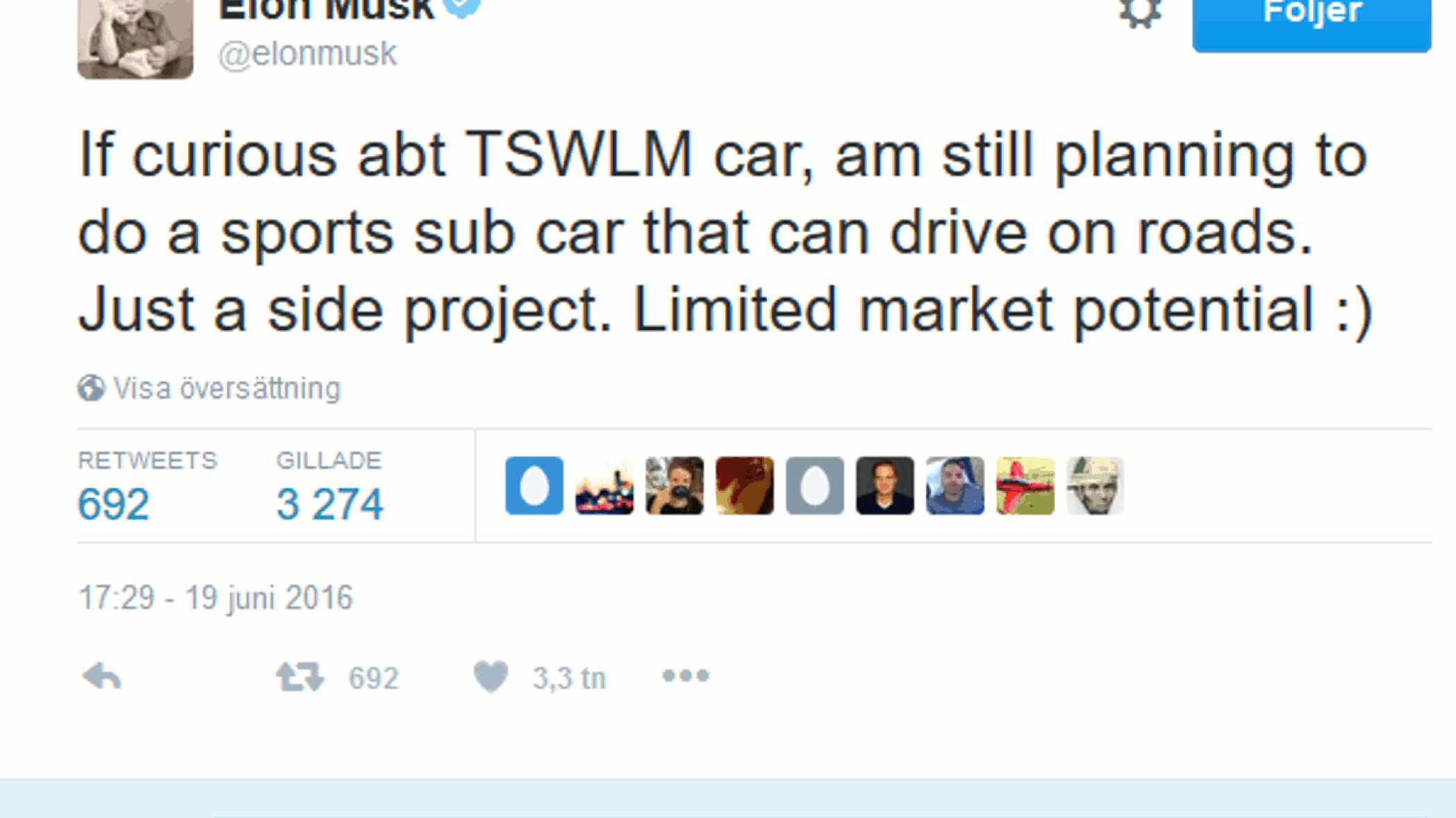 Han fick också vatten på sin kvarn när det handlar om drömmen att bygga en egen version av den vita Lotus Esprit som James Bond körde i 70-talsrullen ”Älskade spion”. ”Jag planerar fortfarande att bygga en sportig undervattensbil som också kan köra på vägar”, twittrade Musk, som dessutom äger bilen från filmen efter att ha ropat in den på auktion för närmare en miljon dollar.