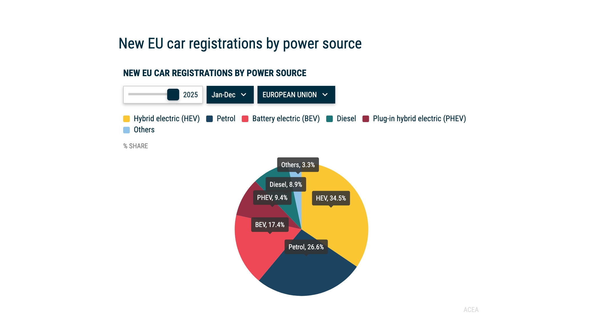 Totalt registrerades det in 1.880.370 nya elbilar i EU under 2025. Det är en ökning på 30 procent jämfört med året innan och elbilarna kom upp i en marknadsandel på 17,4 procent. Året innan var marknadsandelen 14 procent. Trots den kraftiga ökningen ser Acea en potential för att elbilarna ska bli betydligt fler. ”Andelen batterielektriska fordon nådde 17,4 procent och låg därmed i linje med årets prognoser, men lämnar fortfarande utrymme för tillväxt för att hänga med i omställningen”, skriver Acea i ett pressmeddelande.
