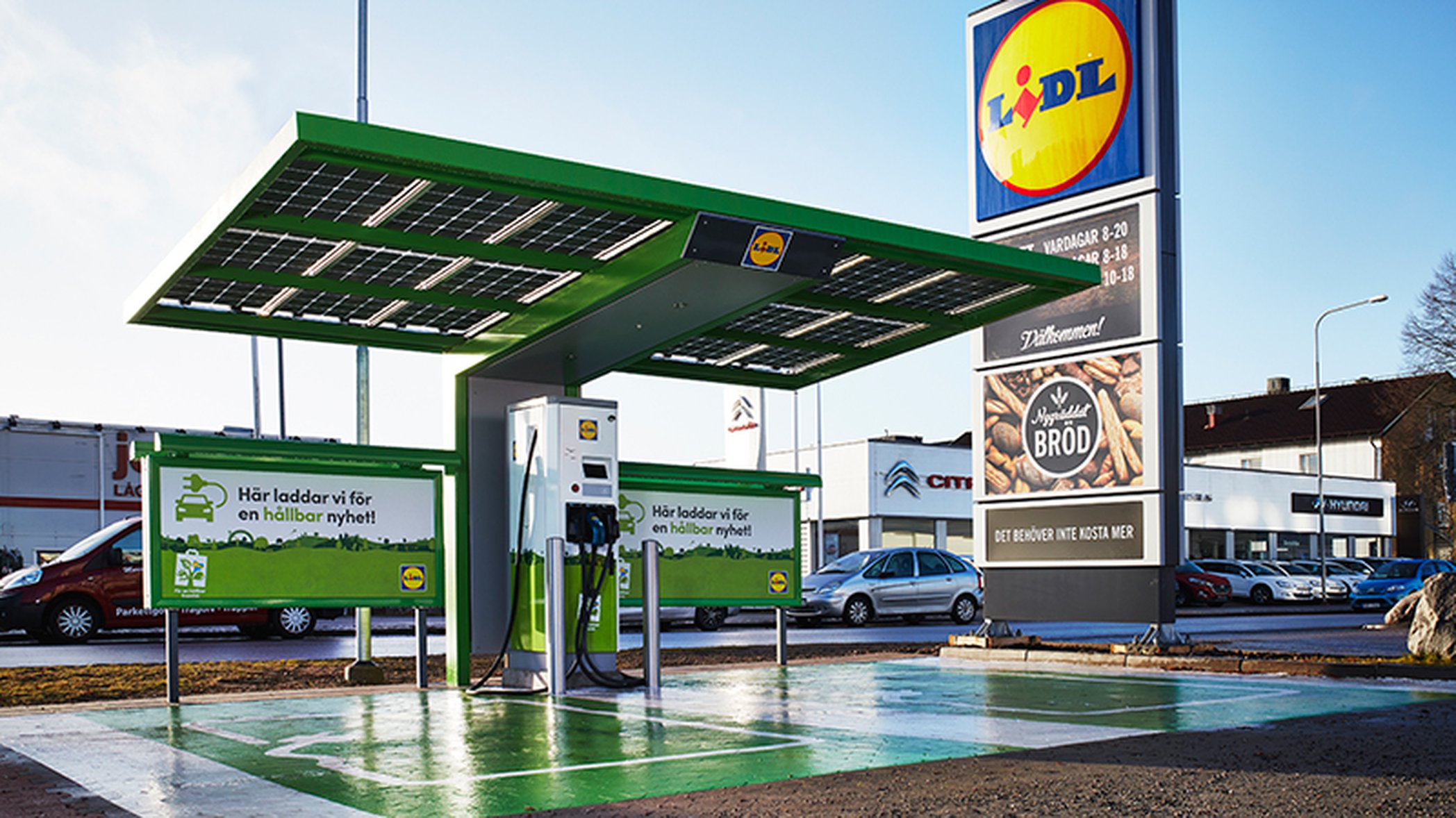 Elen kommer enligt Lidl från solceller på butikens tak eller solceller monterade på väderskydden till laddstationerna. Snabbladdarna har en effekt på 50 kW, och stationerna har alla både CHAdeMO, CCS och Mode 3 typ 2-uttag.