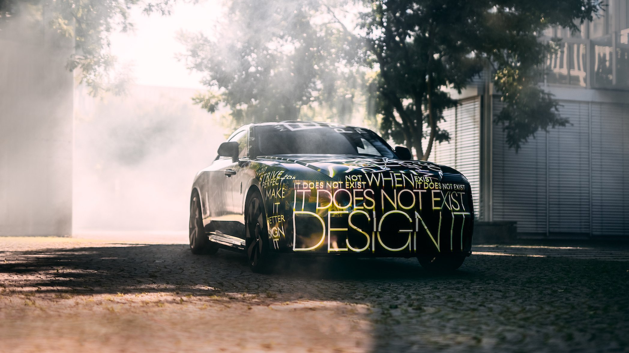 Vi bjuds i alla fall på en lätt maskerad bild av vad som ser ut att vara en tvådörrarscoupé med en rejält tilltagen motorhuv. Till skillnad från Mercedes som valt att skippa stjärnan i fronten för att optimera luftmotståndet på EQS sitter här den klassiska kylarprydnaden ”Spirit of Ecstsy” kvar längst fram på motorhuven.